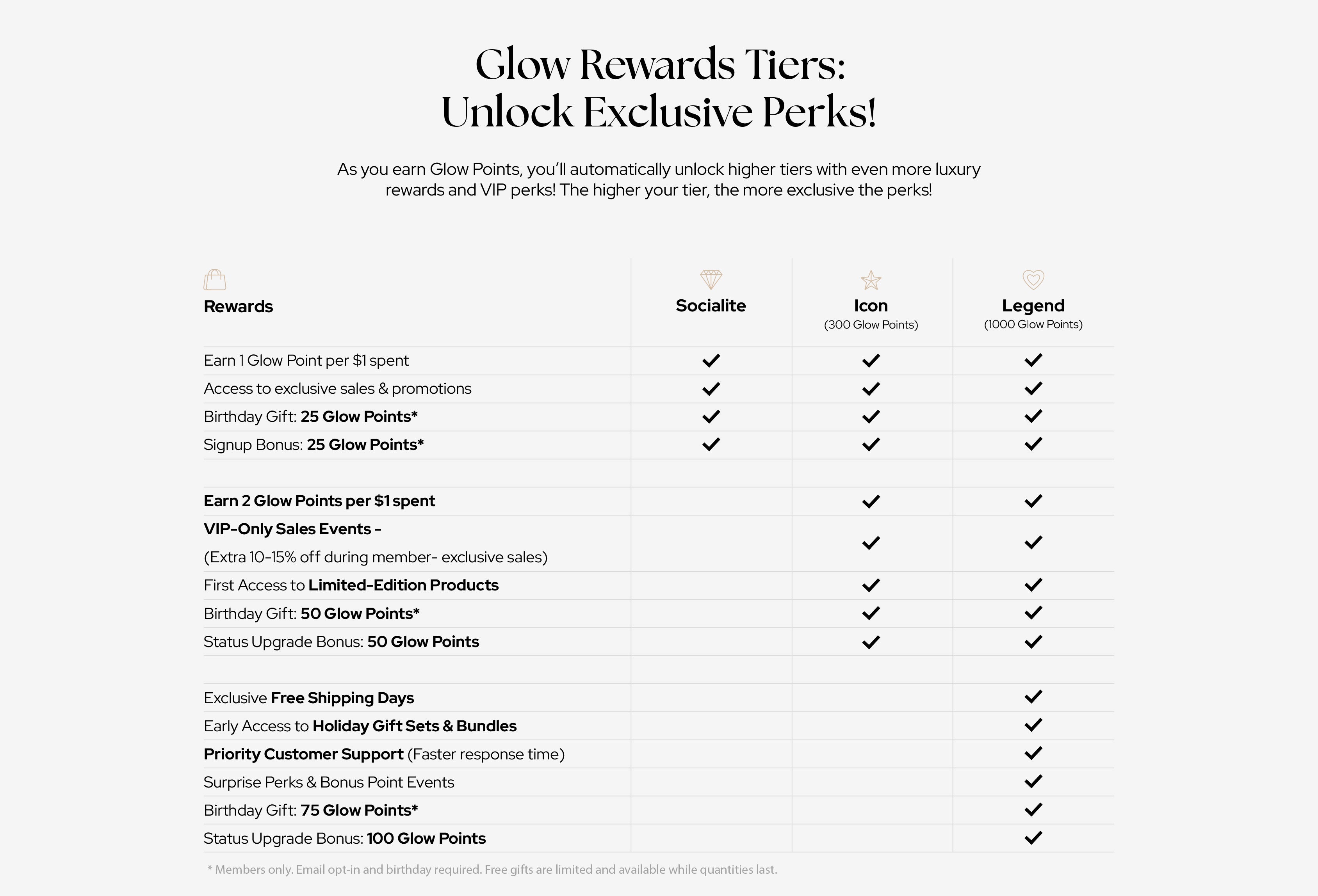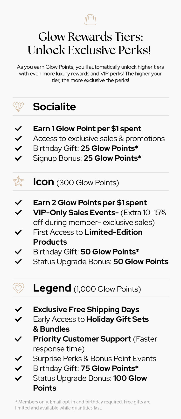 The loyalty program designed to make your beauty shopping even more rewarding! Whether you’re restocking your must-haves or treating yourself to something new, you’ll now earn Glow Points with every purchase and unlock exclusive perks, discounts, and VIP experiences as you level up through our rewards tiers.
