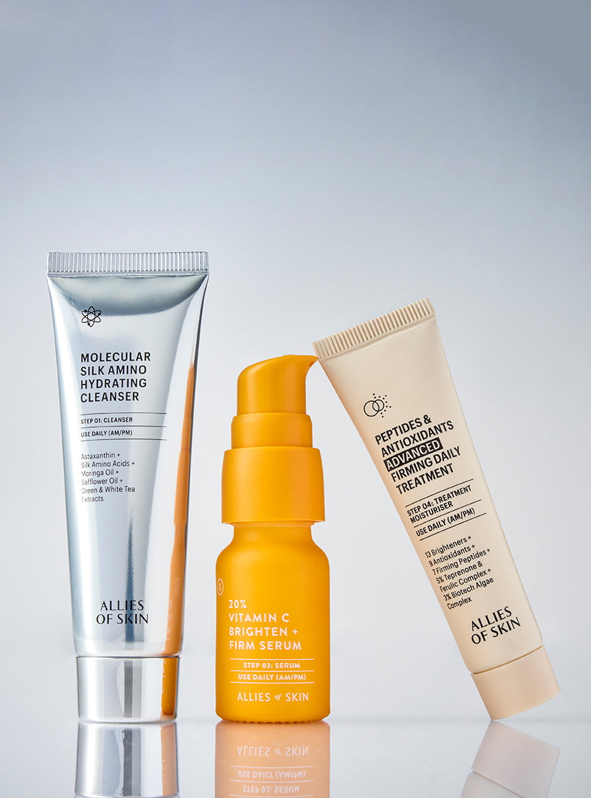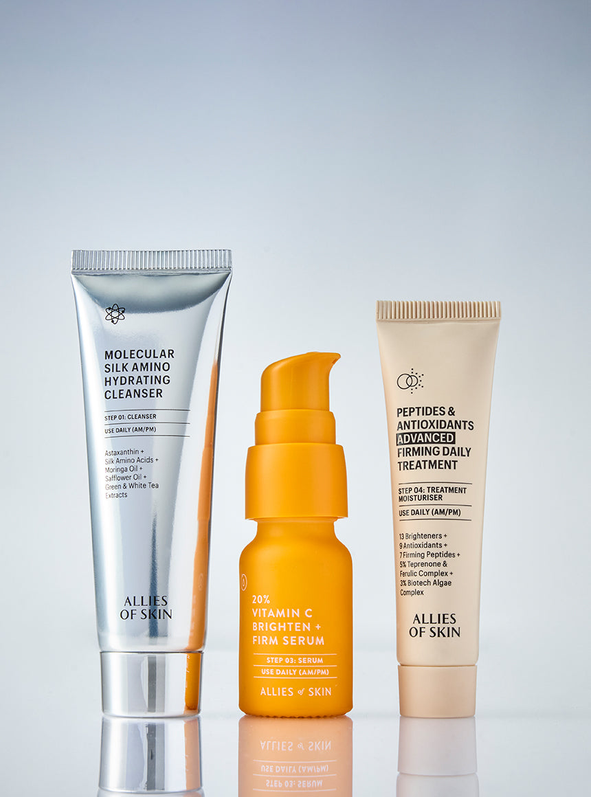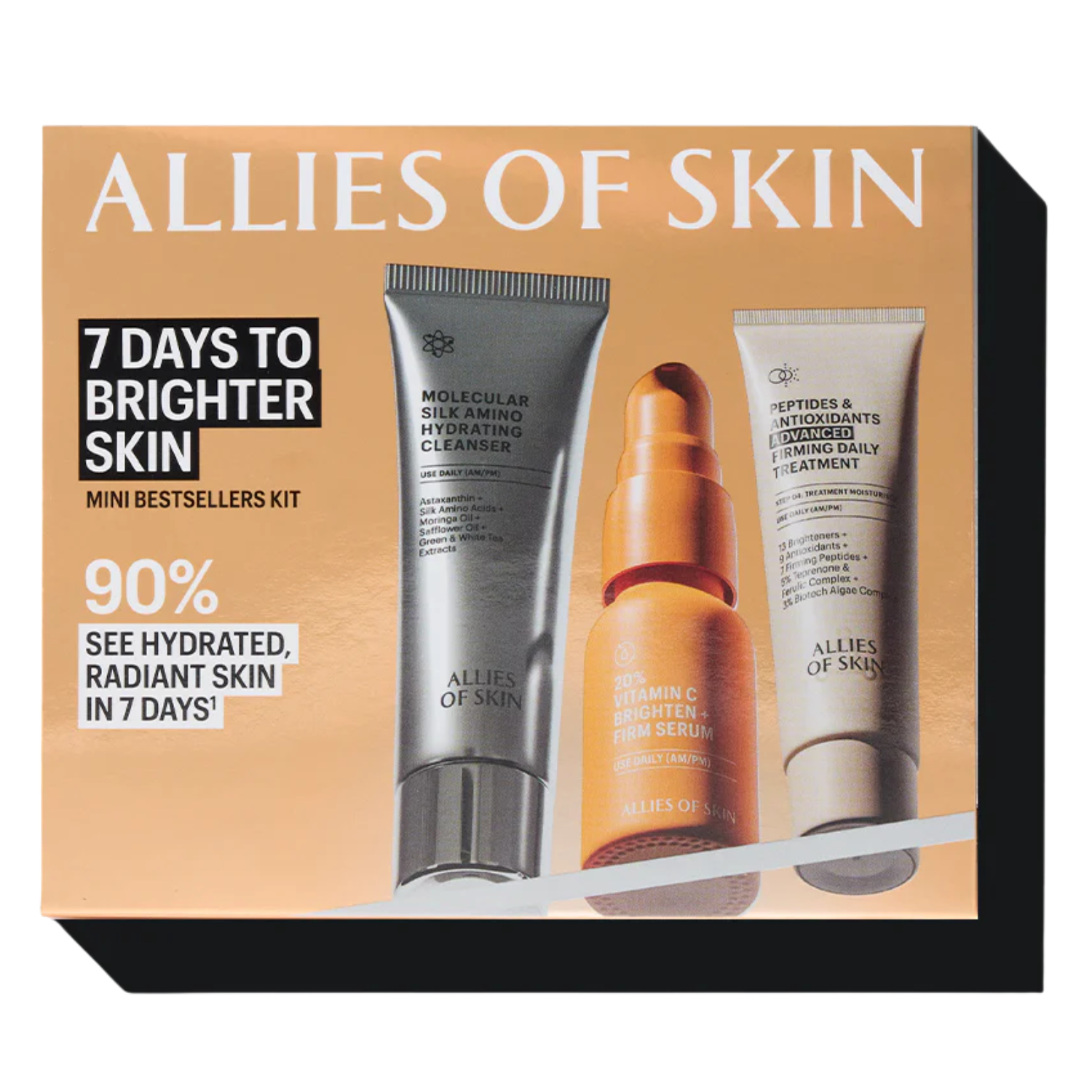 Combining Allies of Skin’s best brightening formulas into one supercharged kit, this trio helps even skin tone, firm, and target discolouration with science-backed actives — including 20% Ethylated L-Ascorbic Acid (Vitamin C), Glutathione, Silk Amino Acids, and Peptides.