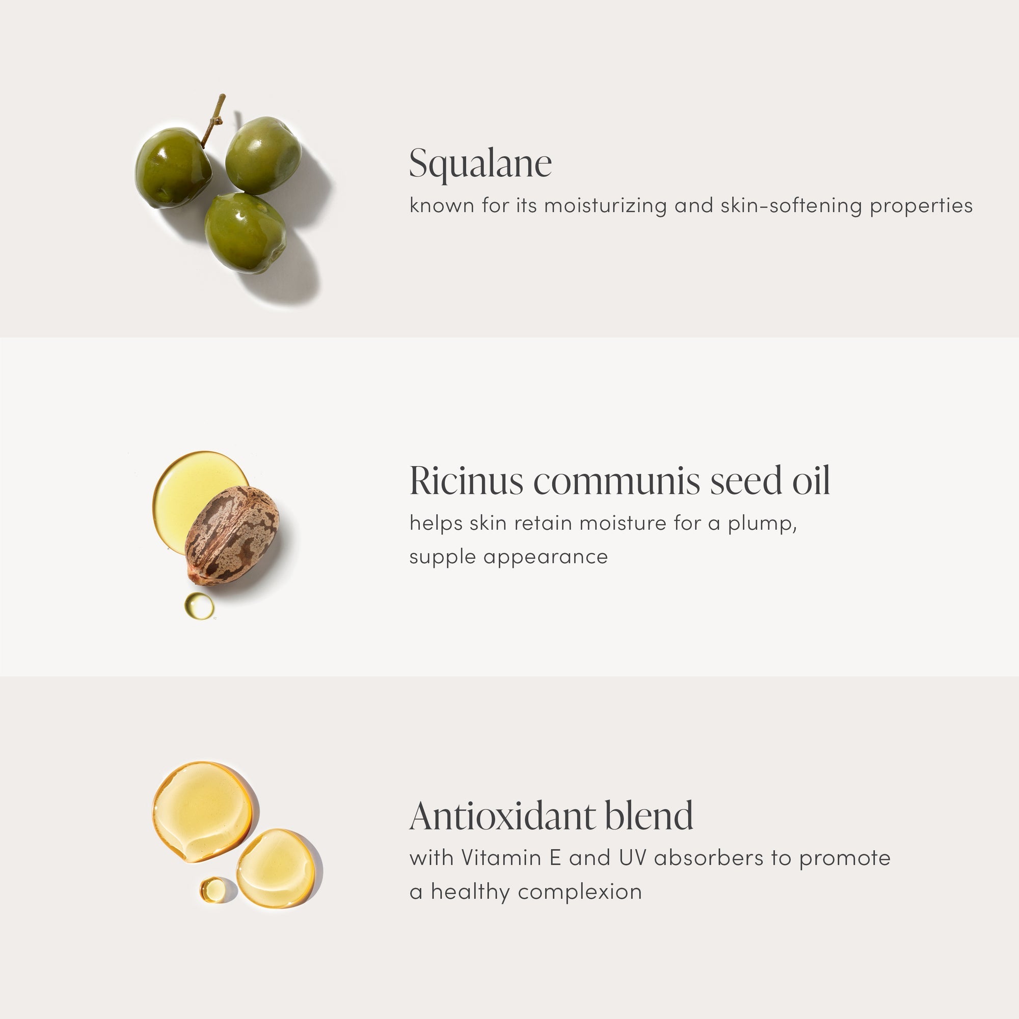Infused with hydrating Squalane and Ricinus Communis (Castor) Seed Oil, it plumps and softens the skin while delivering vibrant, healthy color. An antioxidant blend of Vitamin E and UV absorbers helps protect against environmental stressors, promoting a healthier-looking complexion with every application.