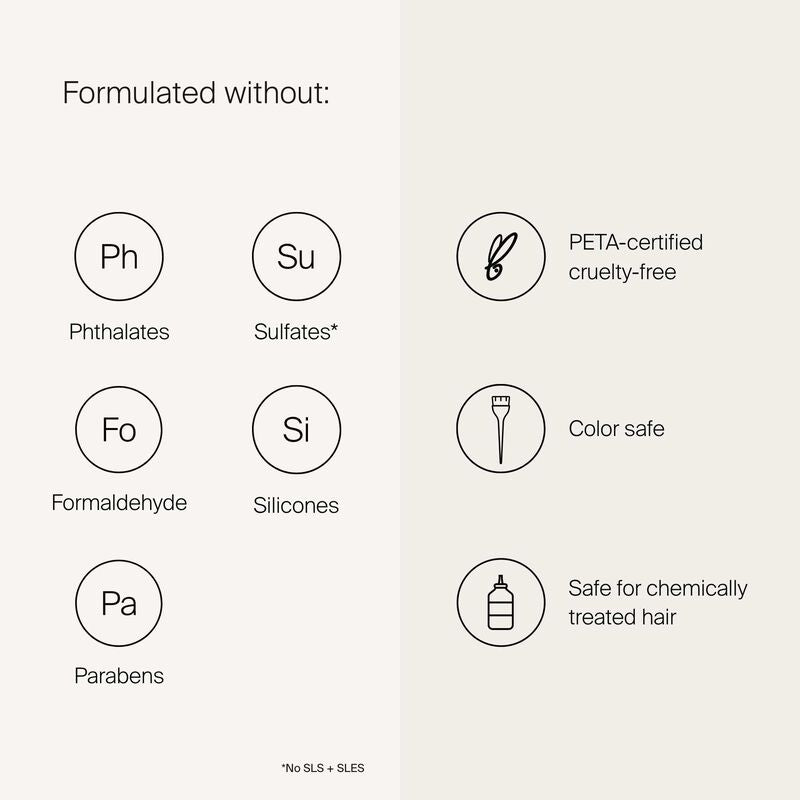FREE FROM PHTHALATES, SULFATES, PARABENS, TALC, FORMALDEHYDE, BENZENE, & SILICONES | CRUELTY-FREE | COLOUR-SAFE | SAFE FOR CHEMICALLY TREATED HAIR
