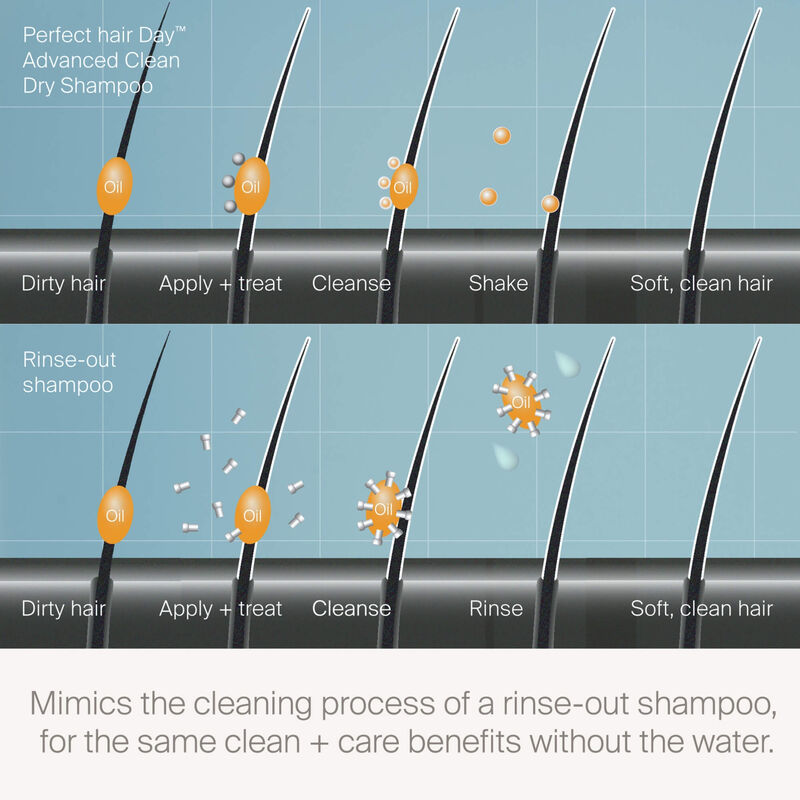 From powders to aerosols, there are countless dry shampoos out there — but they don’t actually clean hair. In fact, most powder-based formulas absorb oil (not sweat) and they leave behind residue that you can see and feel. Perfect hair Day™ Advanced Clean Dry Shampoo is designed to mimic the cleansing power of an actual shampoo, while providing the look and feel of just-washed hair.