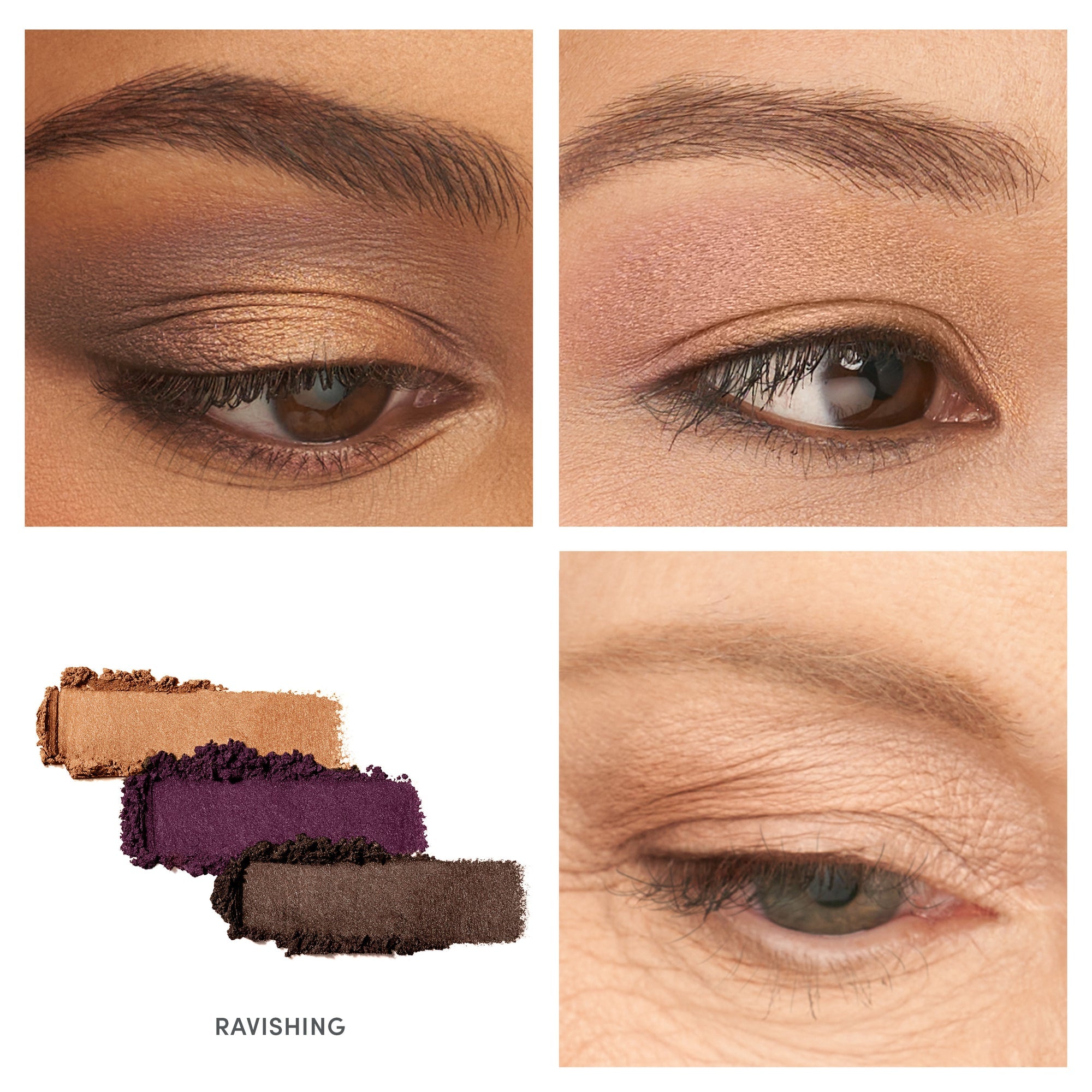 Ravishing shimmery rose gold Mica, Synthetic Fluorphlogopite, Octyldodecyl Stearoyl Stearate, Butyrospermum Parkii (Shea) Butter, Silica, Zinc Stearate, Boron Nitride, Simmondsia Chinensis (Jojoba) Seed Oil, Punica Granatum Seed Oil, Pinus Strobus Bark Extract, Caprylyl Glycol. [+/- Titanium Dioxide (CI 77891), Iron Oxides (CI 77491, CI 77492, CI 77499), Bismuth Oxychloride]. shimmery plum Mica, Synthetic Fluorphlogopite, Octyldodecyl Stearoyl Stearate, Zinc Stearate, Butyrospermum Parkii (Shea) Butter, Silica, Boron Nitride, Simmondsia Chinensis (Jojoba) Seed Oil, Punica Granatum Seed Oil, Pinus Strobus Bark Extract, Caprylyl Glycol, Tin Oxide. [+/- Titanium Dioxide (CI 77891), Iron Oxides (CI 77491, CI 77492, CI 77499), Bismuth Oxychloride, Carmine]. shimmery plum brown Mica, Synthetic Fluorphlogopite, Octyldodecyl Stearoyl Stearate, Silica, Zinc Stearate, Butyrospermum Parkii (Shea) Butter, Boron Nitride, Simmondsia Chinensis (Jojoba) Seed Oil, Punica Granatum Seed Oil, Pinus Strobus Bark Extract, Caprylyl Glycol, Calcium Sodium Borosilicate, Tin Oxide. [+/- Titanium Dioxide (CI 77891), Iron Oxides (CI 77491, CI 77492, CI 77499), Ferric Ferrocyanide, Carmine].