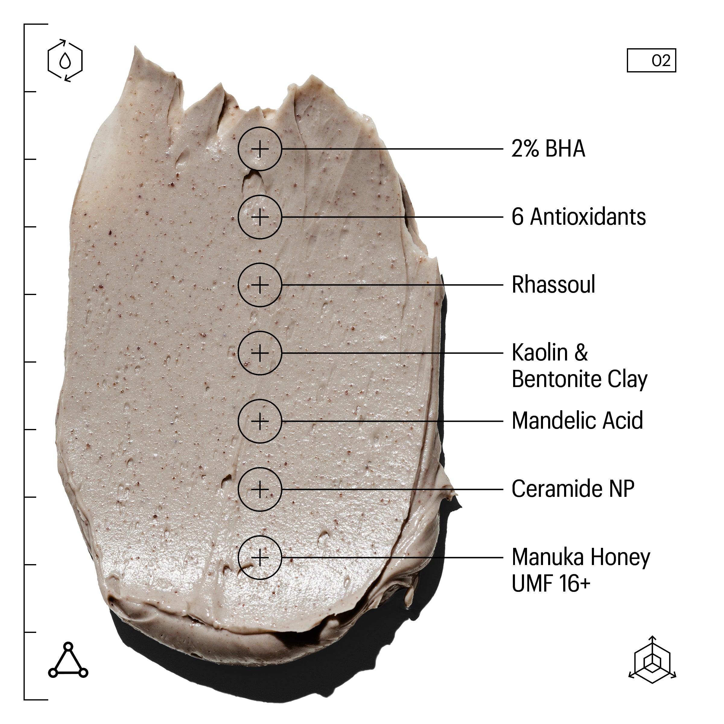 This purifying mask is supercharged with 2% BHA, 6 Antioxidants, Rhassoul, Kaolin & Bentonite Clay, Mandelic Acid, Ceramide NP & Manuka Honey UMF 16+ to help clarify, decongest pores and reduce blackheads, boost radiance, and lightly hydrate the skin. Formulated for all skin types – especially oily and blemish-prone skin.