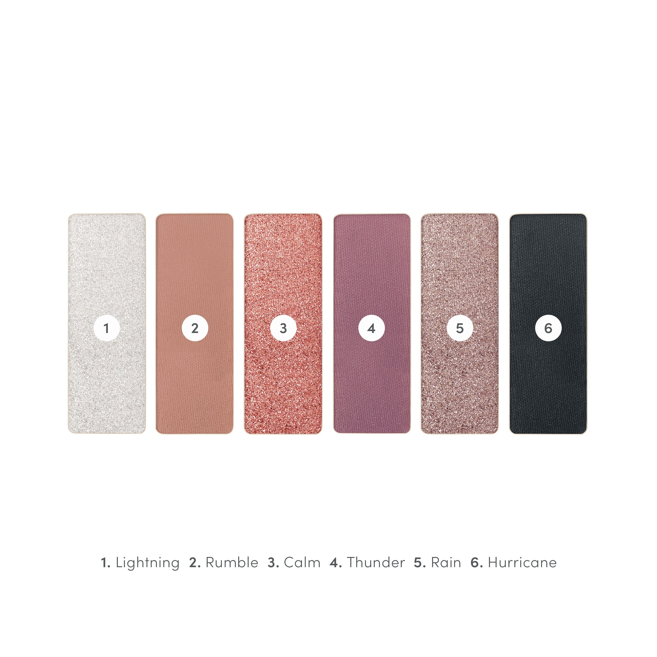 Storm Chaser Lightning Calcium Aluminum Borosilicate, Synthetic Fluorphlogopite, Mica, Titanium Dioxide (CI 77891), Octyldodecyl Stearoyl Stearate, Butyrospermum Parkii (Shea) Butter, Caprylic/Capric Triglyceride, Boron Nitride, Simmondsia Chinensis (Jojoba) Seed Oil, Punica Granatum Seed Oil, Pinus Strobus Bark Extract, Tin Oxide, Caprylyl Glycol, Zinc Stearate. Rumble Synthetic Fluorphlogopite, Mica, Zinc Stearate, Octyldodecyl Stearoyl Stearate, Caprylic/Capric Triglyceride, Boron Nitride, Butyrospermum Parkii (Shea) Butter, Simmondsia Chinensis (Jojoba) Seed Oil, Tin Oxide, Punica Granatum Seed Oil, Pinus Strobus Bark Extract Triethoxycaprylylsilane, Caprylyl Glycol. [+/- Iron Oxides (CI 77491, CI 77492, CI 77499), Titanium Dioxide (CI 77891), Ultramarines]. Calm Synthetic Fluorphlogopite, Mica, Butyrospermum Parkii (Shea) Butter, Octyldodecyl Stearoyl Stearate, Boron Nitride, Zinc Stearate, Caprylic/Capric Triglyceride, Simmondsia Chinensis (Jojoba) Seed Oil, Punica Granatum Seed Oil, Pinus Strobus Bark Extract, Caprylyl Glycol, Tin Oxide, Silica. [+/- Iron Oxides (CI 77491, CI 77492, CI 77499), Titanium Dioxide (CI 77891), Bismuth Oxychloride (CI 77163)]. Thunder Synthetic Fluorphlogopite, Mica, Octyldodecyl Stearoyl Stearate, Butyrospermum Parkii (Shea) Butter, Caprylic/Capric Triglyceride, Boron Nitride, Simmondsia Chinensis (Jojoba) Seed Oil, Tin Oxide, Punica Granatum Seed Oil, Pinus Strobus Bark Extract, Caprylyl Glycol, Triethoxycaprylylsilane, Zinc Stearate. [+/- Iron Oxides (CI 77491, CI 77492, CI 77499), Titanium Dioxide (CI 77891), Manganese Violet, Ultramarines]. Rain Synthetic Fluorphlogopite, Mica, Octyldodecyl Stearoyl Stearate, Zinc Stearate, Caprylic/Capric Triglyceride, Boron Nitride, Butyrospermum Parkii (Shea) Butter, Simmondsia Chinensis (Jojoba) Seed Oil, Punica Granatum Seed Oil, Pinus Strobus Bark Extract, Caprylyl Glycol, Tin Oxide. [+/- Iron Oxides (CI 77491, CI 77492, CI 77499), Titanium Dioxide (CI 77891)]. Hurricane Synthetic Fluorphlogopite, Zinc Stearate, Silica, Butyrospermum Parkii (Shea) Butter, Octyldodecyl Stearoyl Stearate, Caprylic/Capric Triglyceride, Triethoxycaprylylsilane, Boron Nitride, Simmondsia Chinensis (Jojoba) Seed Oil, Punica Granatum Seed Oil, Pinus Strobus Bark Extract, Caprylyl Glycol. [+/- Iron Oxides (CI 77491, CI 77492, CI 77499), Titanium Dioxide (CI 77891)].