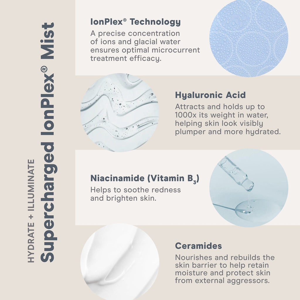 Powered by IonPlex®, a blend of glacial water and ions, this mist deeply hydrates skin to enhance microcurrent treatment efficacy and refresh skin throughout the day. Cleanly formulated with niacinamide and ceramides to lock in moisture and reduce the appearance of fine lines and pores for a plumper, more radiant appearance.