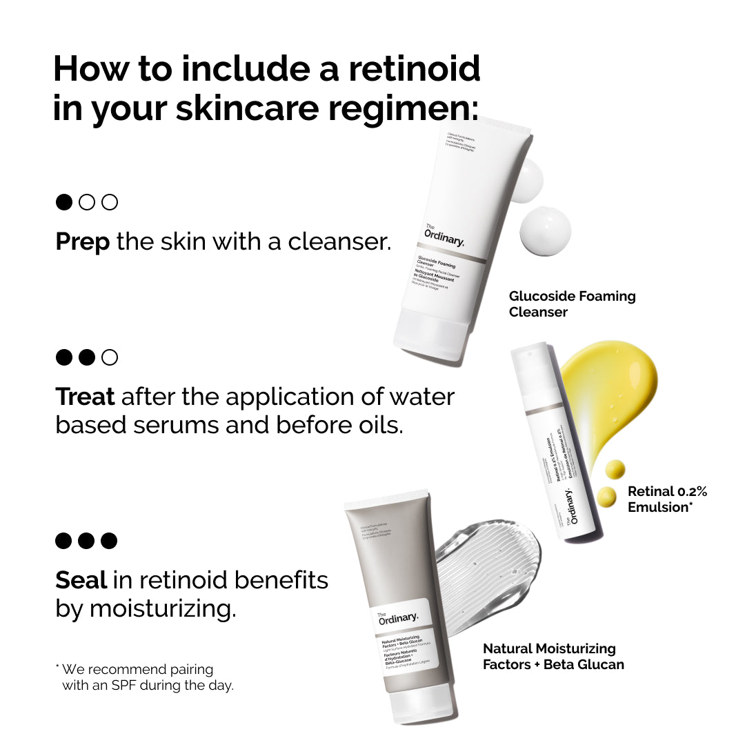 Retinal 0.2% Emulsion also contains synthetic oat analogues (specifically avenanthramide a key beneficial component found in oats). This ingredient is known to help target skin discomfort and dryness, which are common concerns associated with retinoid use.